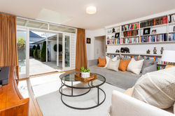 The fourth bedroom, tucked away at the southern end of the home, includes its own ensuite and private street access, making it an ideal guest suite or semi-independent space for extended family. A second lounge adjacent to this bedroom, lined with built-in bookcases, would make the perfect library, den, or media room. This area leads to a paved courtyard featuring cottage gardens, mature plantings, an outdoor shower for washing off the sand after a day at the beach, and is positioned perfectly to capture the afternoon sun. There is also a large family bathroom to service the two bedrooms and an office on this level.