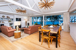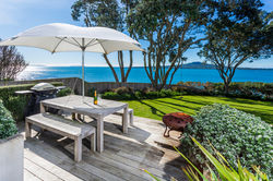 Uninterrupted sea views stretch over the lush, manicured lawns framed by beautiful Pohutukawa trees, creating a picture-perfect setting that captures the very essence of relaxed waterfront living. With its classic “white-on-white” palette, this home radiates understated elegance.
