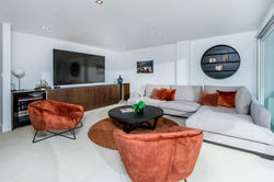 The ground level is designed for poolside living with a third lounge, heated tiled floors, built-in bar fridges, wine cellar, two further double bedrooms and a large family bathroom. Outdoors, the heated pool and private gardens create a sanctuary, while the gated path to the lake makes launching water toys effortless.