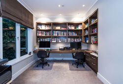 The main family and dining area spans the width of the home, flowing to a sun-soaked terrace and generous flat lawn, perfectly positioned to capture sea views stretching across to Rangitoto Island. A large office, guest powder room, separate laundry and internal-access triple garaging complete this level.